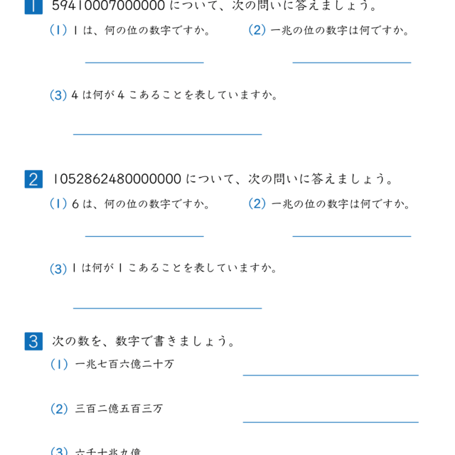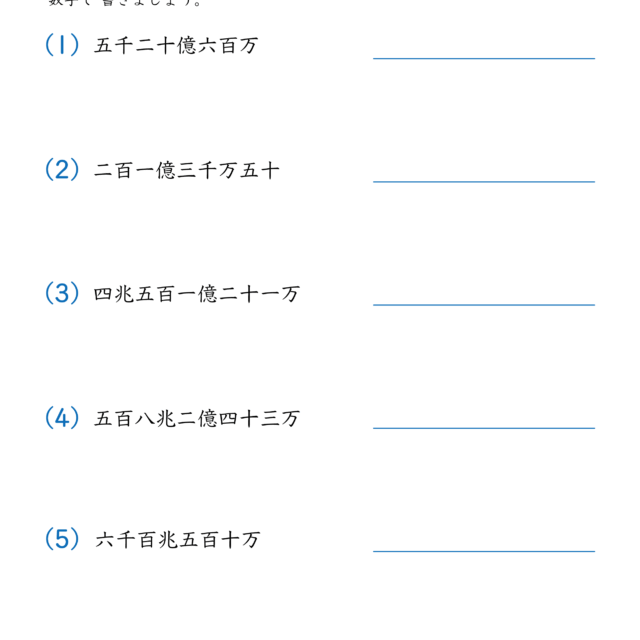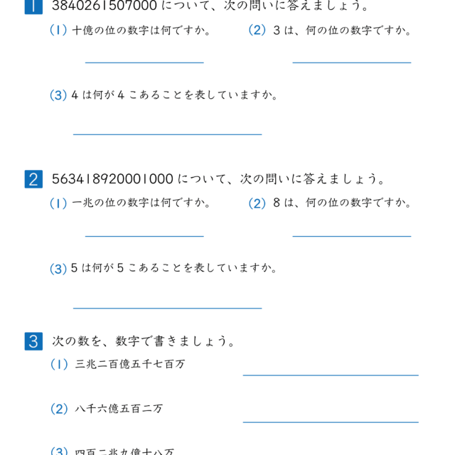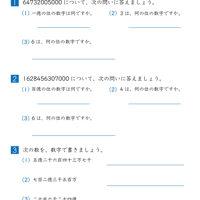 | 2025年12月 | 「10000より大きい数(万・億の表し方・しくみ)|練習問題|小学3年生|算数プリント」大きい数(万・億)の表し方(漢数字→数字)を4枚更新 | 小学生教材 |