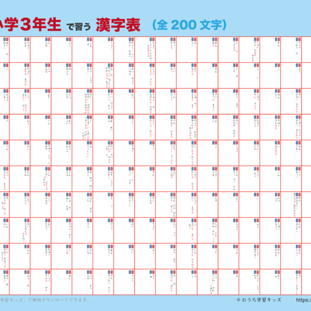 国語プリント 自分で書いて飾れる漢字表・ポスター(小学3年生)ブルー 自分で書いて飾れる漢字一覧表・ポスター(小学3年生)ブルー。子どもが書いた小3漢字の文字をポスターとして飾りたい方・記念に残したい方、暗記できたかまとめて確認したい方向け。B4サイズとA4サイズ。PDFファイルを無料ダウンロード印刷。 2025.09.24 国語プリント小学生教材漢字練習プリント漢字表・ポスター