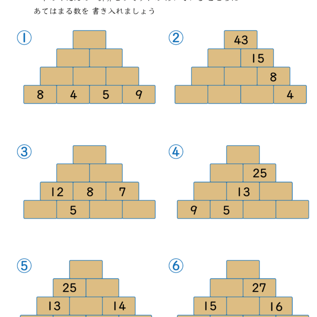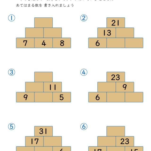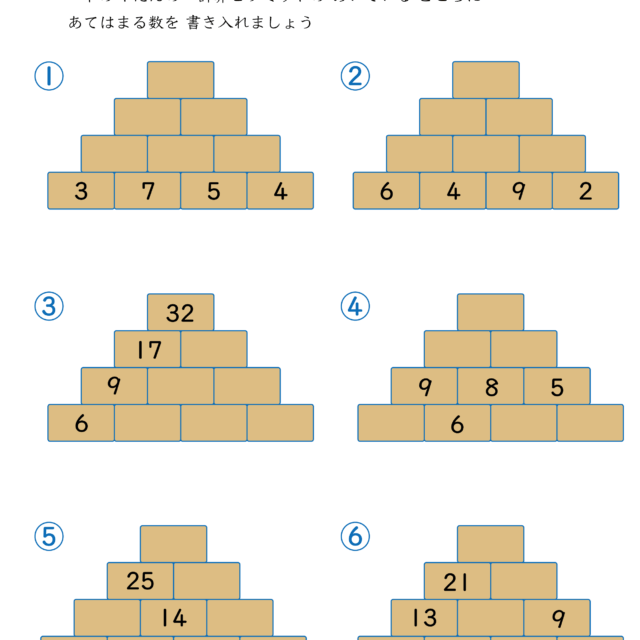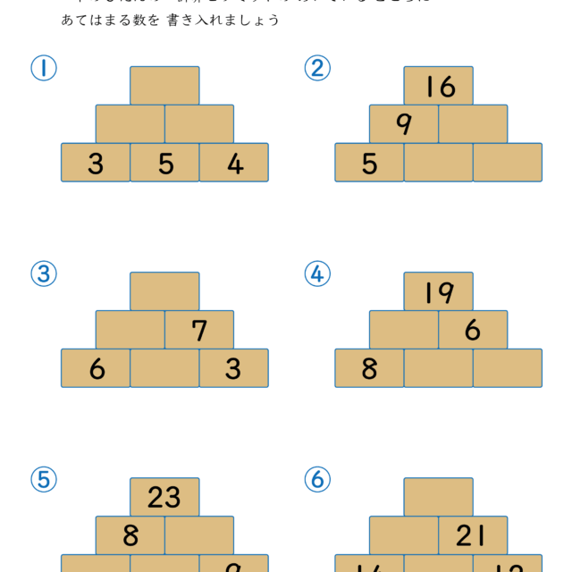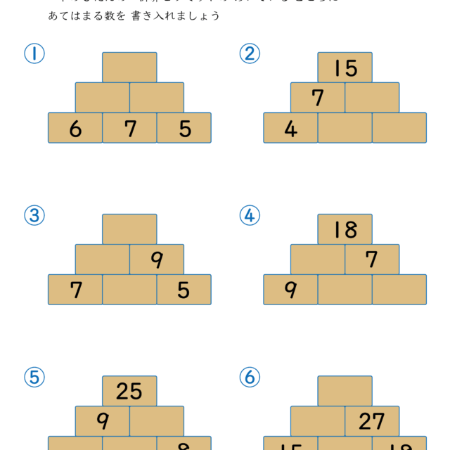 小学生教材 計算ピラミッド(3段)|練習問題1|小学2年生|算数プリント 計算ピラミッド(3段)練習問題 1枚目|小学2年生|算数プリント。足し算と引き算を使うパズルゲームのような応用問題。答えもあり。PDFファイルを無料ダウンロード&印刷。 2025.09.26 小学生教材算数プリント計算ピラミッド