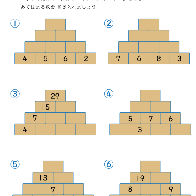 小学生教材 計算ピラミッド(4段)|練習問題1|小学2年生|算数プリント 計算ピラミッド(4段)練習問題 1枚目|小学2年生|算数プリント。足し算と引き算を使うパズルゲームのような応用問題。答えもあり。PDFファイルを無料ダウンロード&印刷。 2025.09.26 小学生教材算数プリント計算ピラミッド