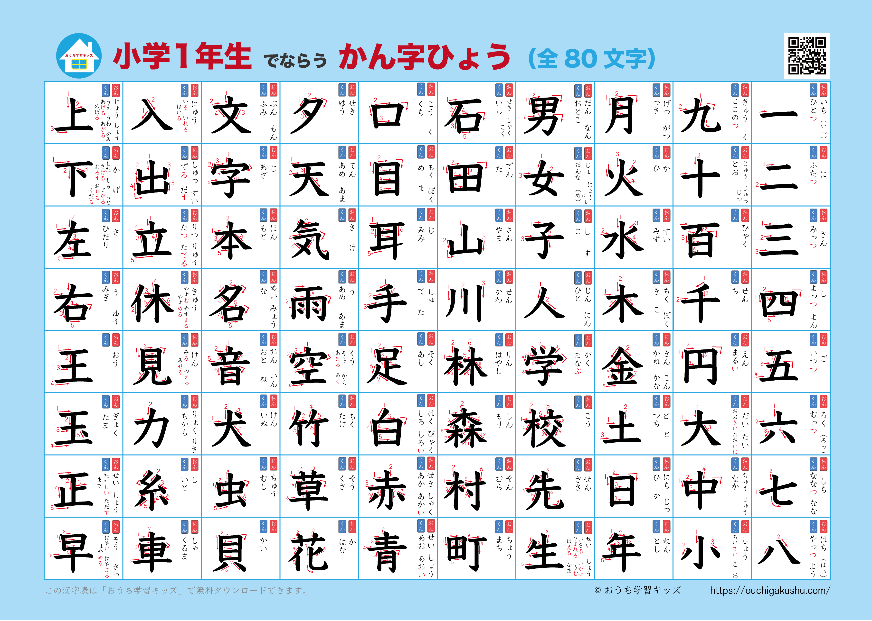 • 小学1年生で学習する漢字(80字)一覧表・ポスター