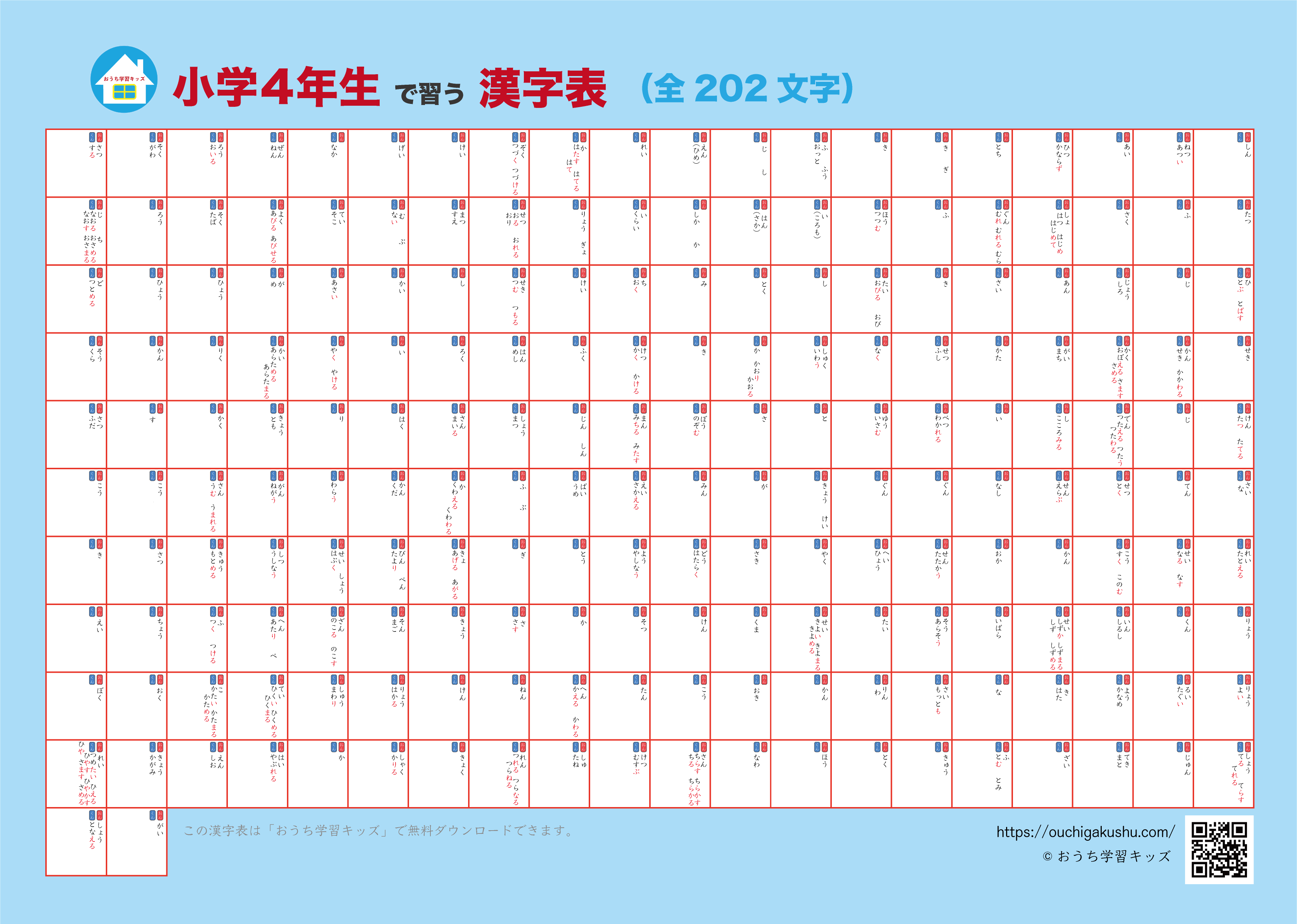 以上の方向けの「漢字表・ポスター(小学4年生)」になります。
