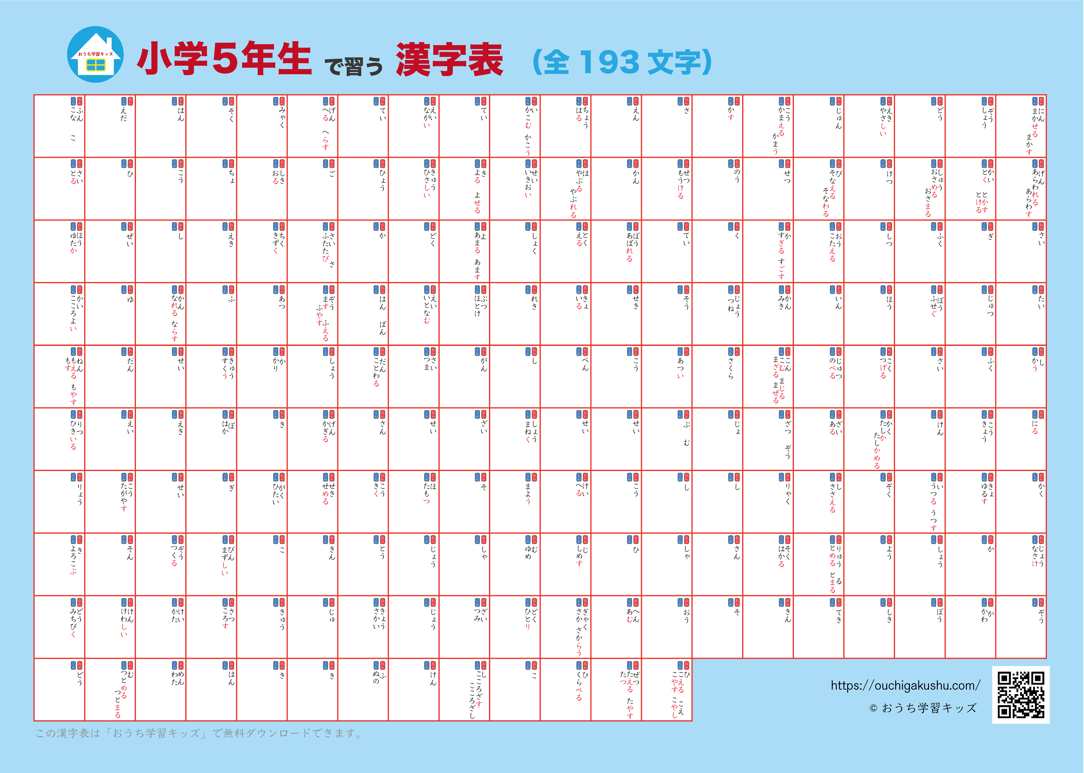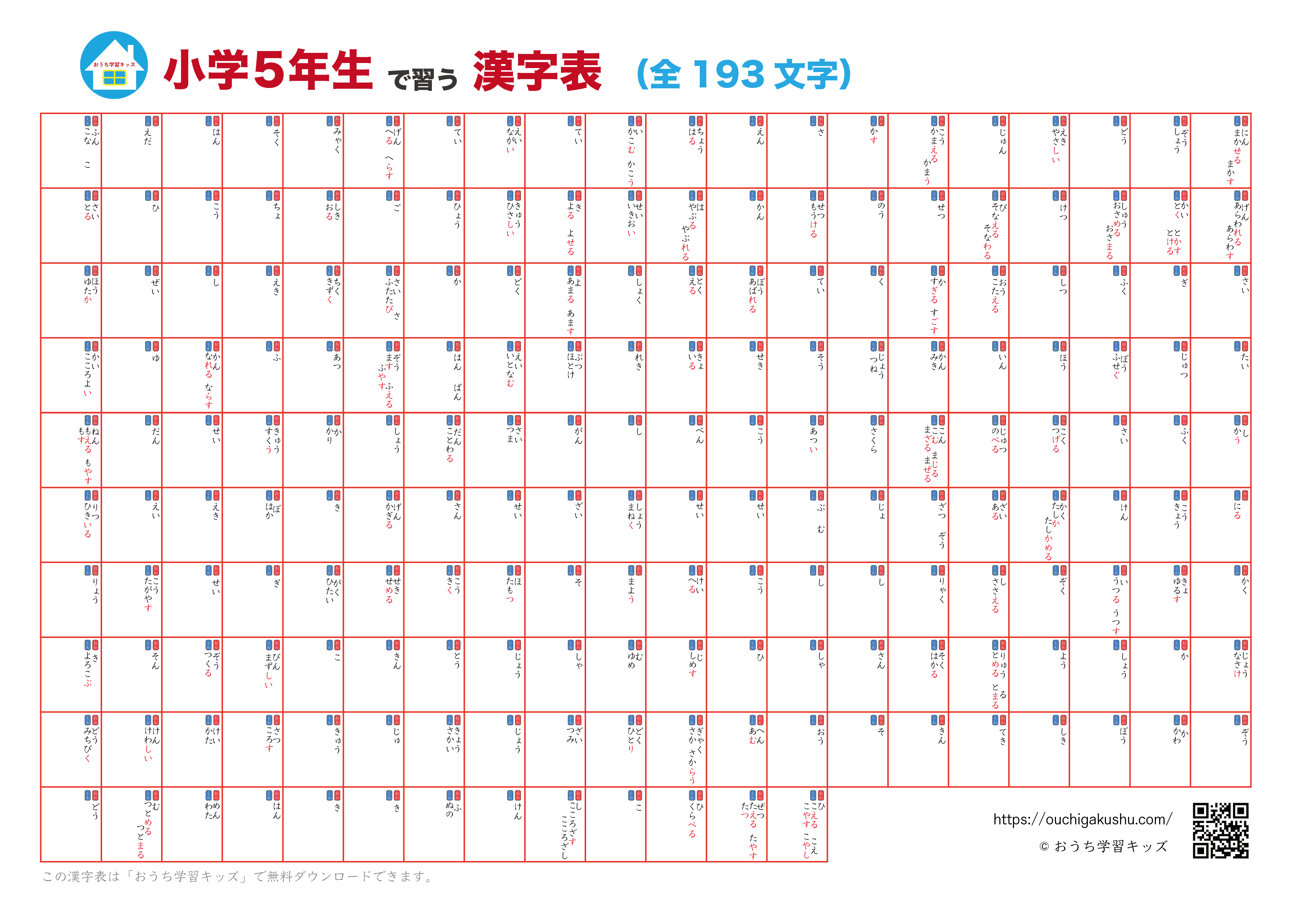 - 自分で書いて飾れる小学5年生で学習する漢字(193字)一覧表・ポスター