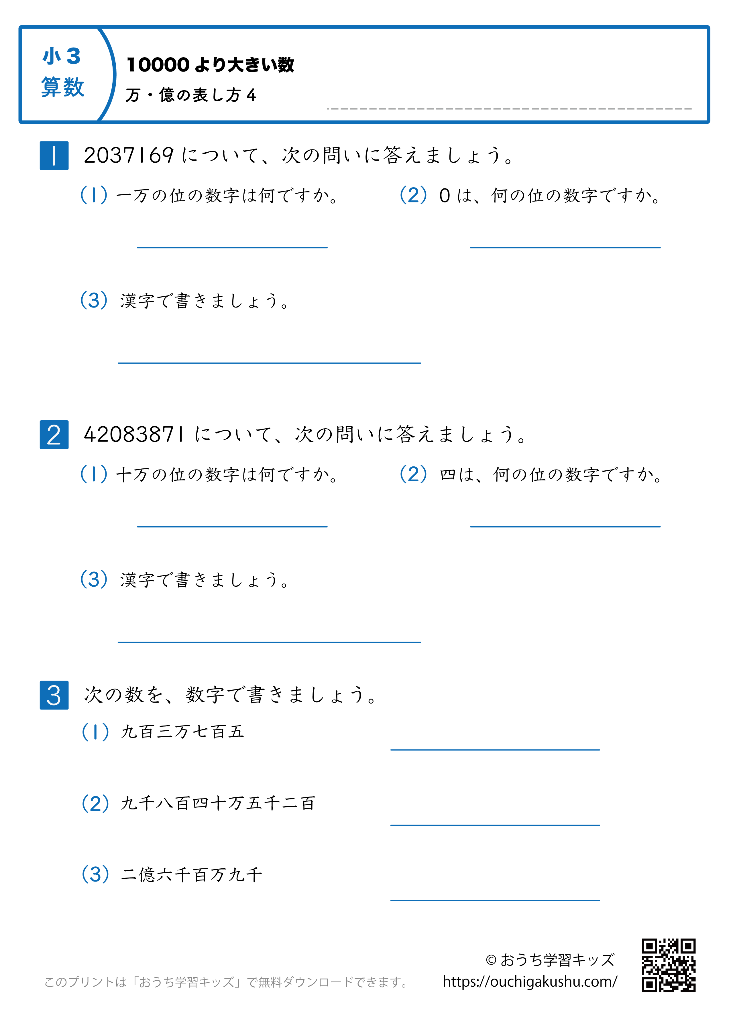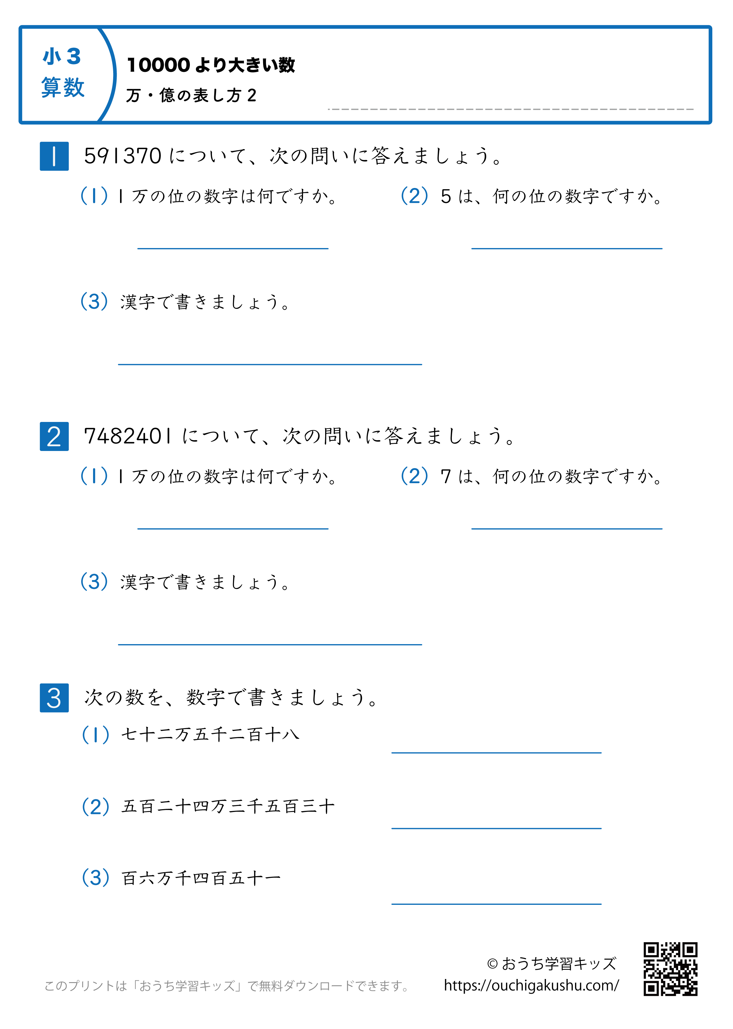 カテゴリー「小学生教材・プリント」>「算数プリント」>「10000より大きい数(万・億の表し方・しくみ)|練習問題|小学3年生|算数プリント」