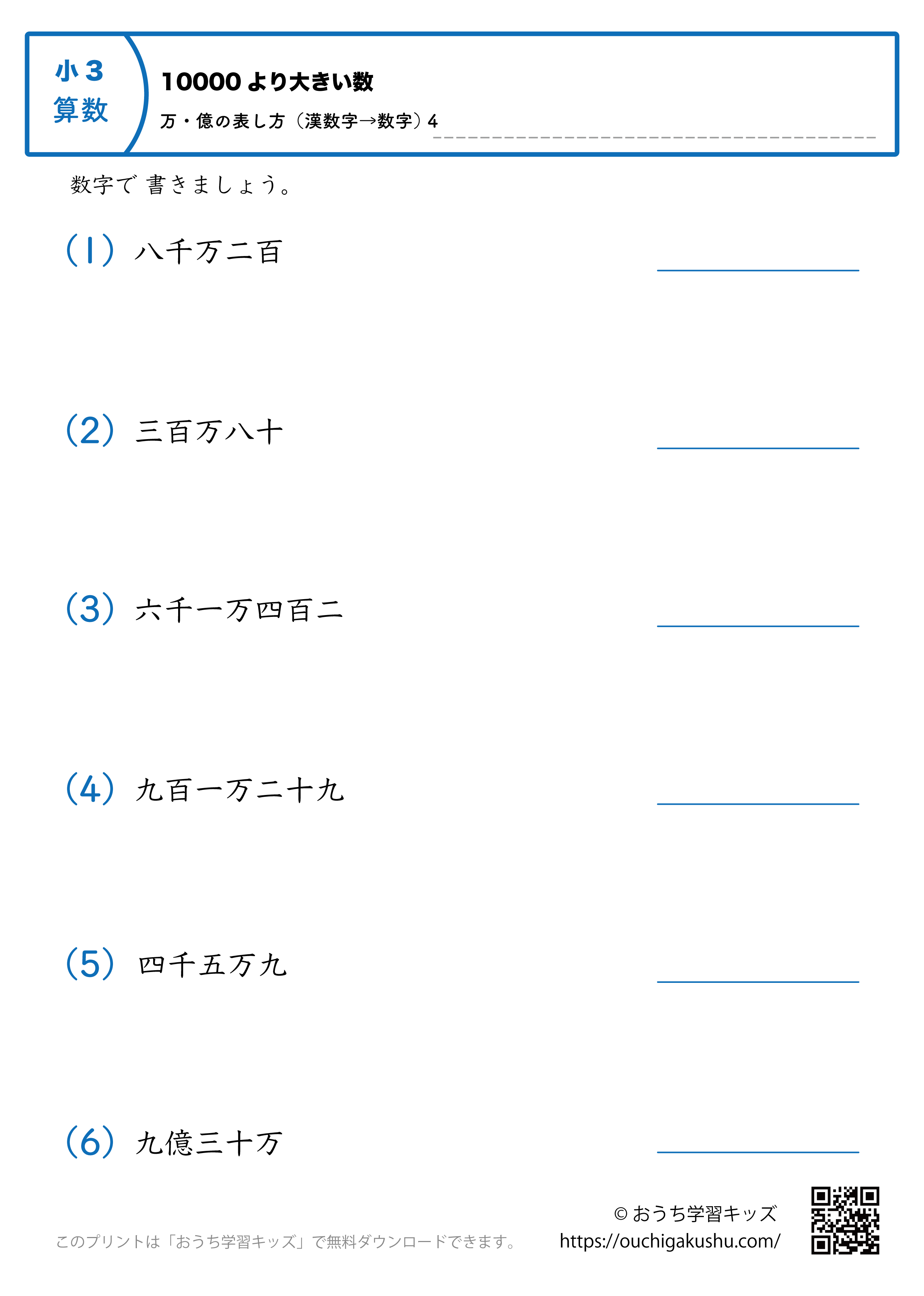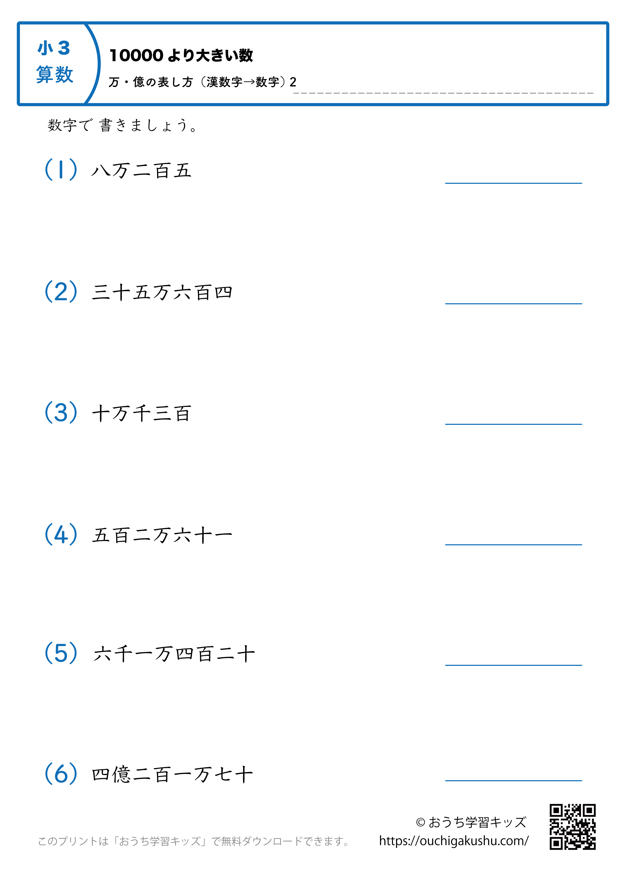 - 小学3年生の算「10000より大きい数:万・億の表し方(数字→漢数字)」3枚目