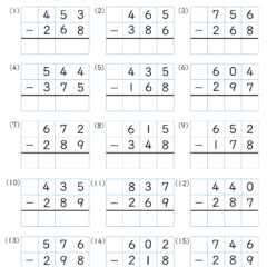 カテゴリー「小学生教材・プリント」>「算数プリント」>「引き算・筆算(3桁)|算数プリント|練習問題|小学3年生」