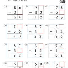 カテゴリー「小学生教材・プリント」>「算数プリント」>「虫食い算・引き算(筆算・2桁−2桁)|算数プリント|練習問題|小学2年生」