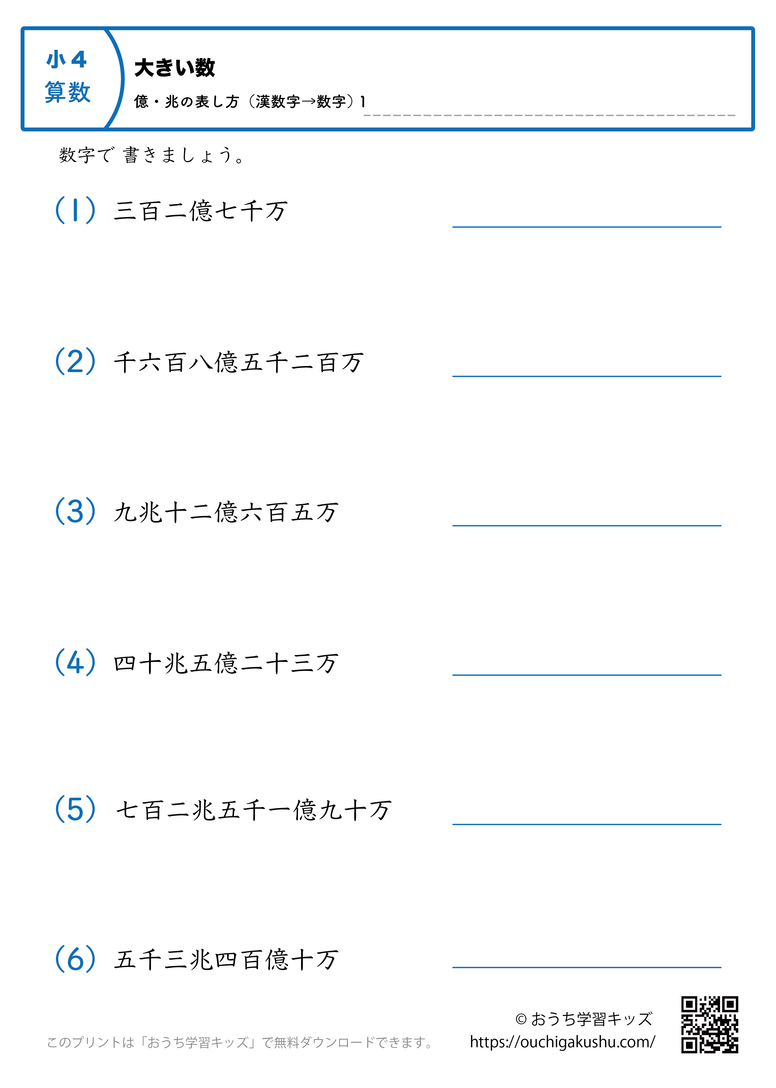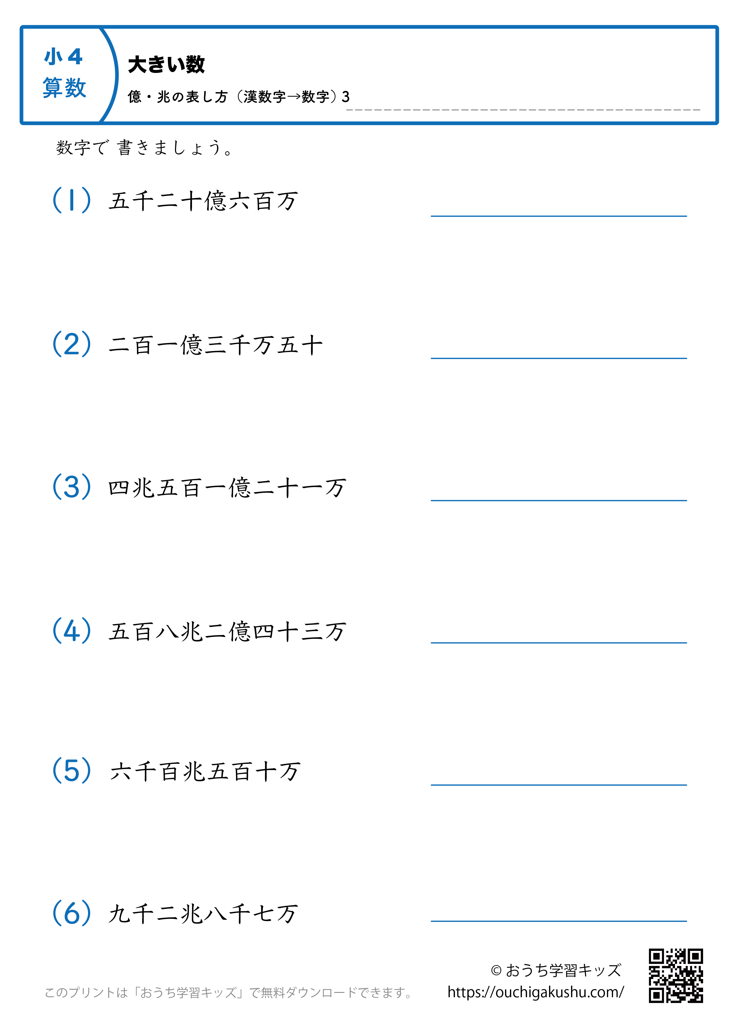 カテゴリー「小学生教材・プリント」>「算数プリント」>「大きい数(億・兆の表し方・しくみ)|練習問題|小学4年生|算数プリント」