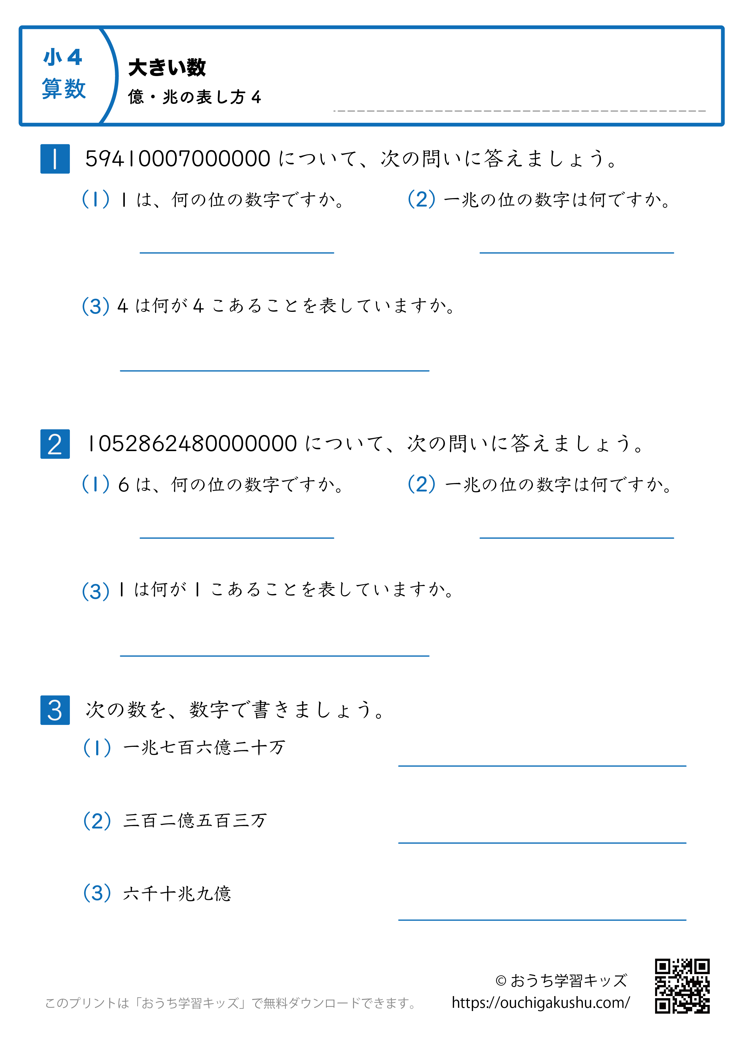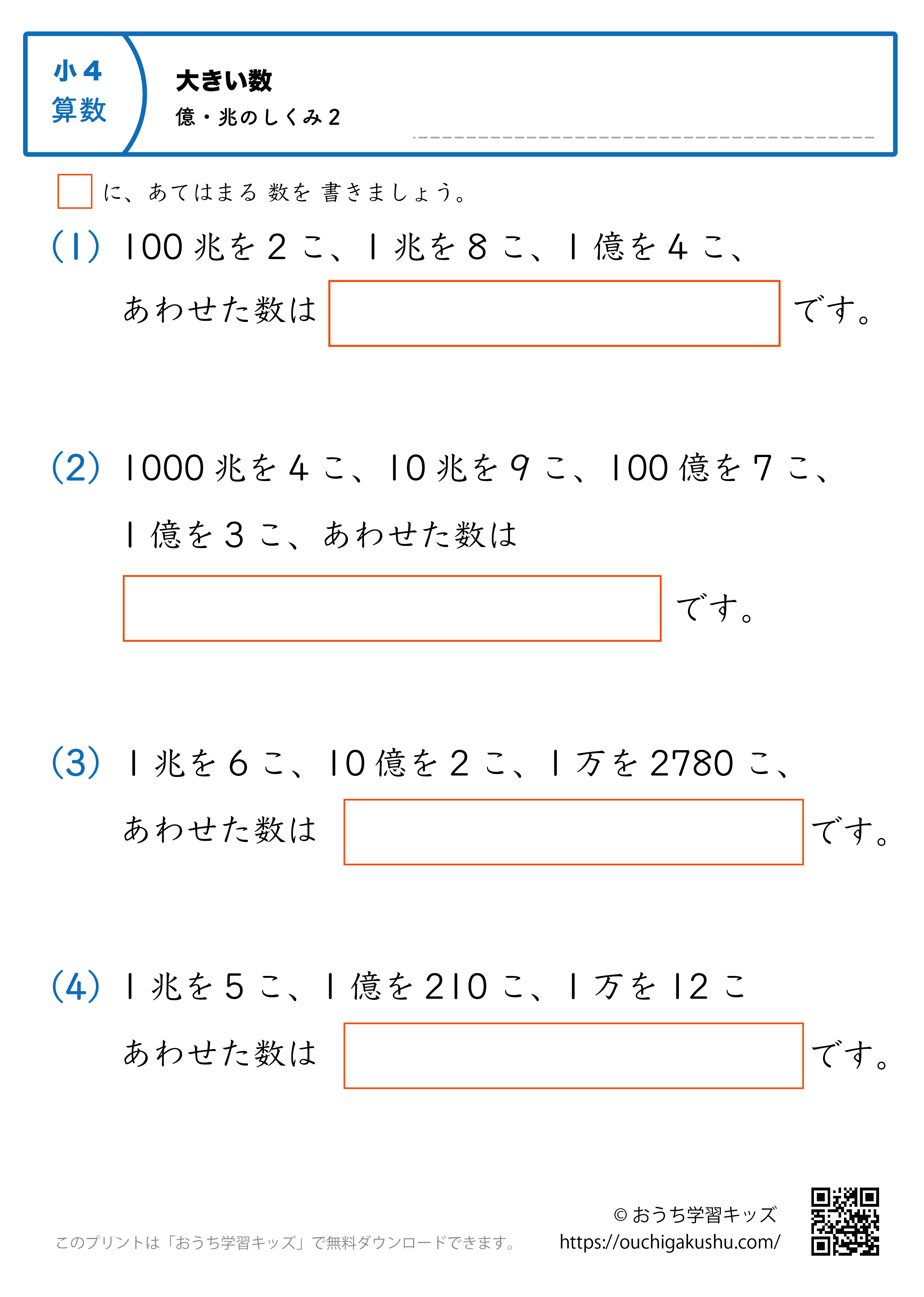 カテゴリー「小学生教材・プリント」>「算数プリント」>「大きい数(億・兆の表し方・しくみ)|練習問題|小学4年生|算数プリント」