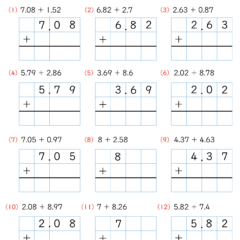 • 式(小数の足し算)を筆算の枠(マス)に書いて計算する練習