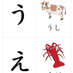 - A4サイズに2文字ずつ、左側が文字、右側が絵(イラスト)を入れたひらがなカード
