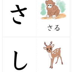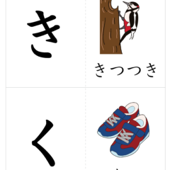- A4サイズに2文字ずつ、左側が文字、右側が絵(イラスト)を入れたひらがなカード