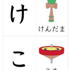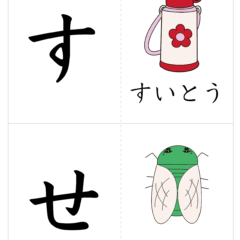 - A4サイズに2文字ずつ、左側が文字、右側が絵(イラスト)を入れたひらがなカード