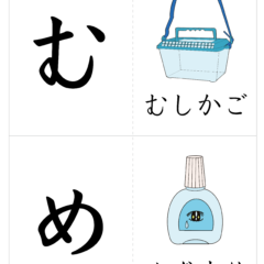 - A4サイズに2文字ずつ、左側が文字、右側が絵(イラスト)を入れたひらがなカード