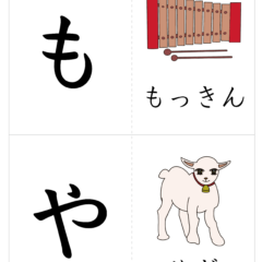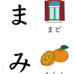 - A4サイズに2文字ずつ、左側が文字、右側が絵(イラスト)を入れたひらがなカード