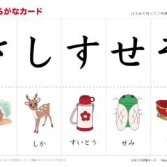 「幼児教材・知育プリント」>「ひらがな練習プリント」「ひらがなカード(あいうえおカード)」>「ひらがなカード(あいうえおカード)表側「文字」・裏側「絵」