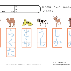 ひらがな単語練習プリント「動物1」(簡単なぞり書き) スポンサーリンク ひらがな単語練習プリント X Facebook はてブ LINE Pinterest 2021.06.162021.09.13 「幼児教材・知育プリント」>「ひらがな練習プリント」>「ひらがな単語練習プリント」 ひらがな(平仮名)単語「動物1」の練習ができます。 簡単なぞり書き練習用プリント 動物の種類:ねこ・さる・やぎ・くま・きりん・ろば 下の「プリントページ」から無料でダウンロードして、印刷しプリントにできます(PDFファイル)。 プリントページ