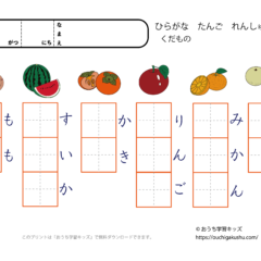 ひらがな単語練習プリント「果物」(簡単なぞり書き) スポンサーリンク ひらがな単語練習プリント X Facebook はてブ LINE Pinterest 2021.09.16 「幼児教材・知育プリント」>「ひらがな練習プリント」>「ひらがな単語練習プリント」 ひらがな(平仮名)単語「果物」の練習ができます。 簡単なぞり書き練習用プリント 果物の種類:なし、みかん、りんご、かき、すいか、もも 下の「プリントページ」から無料でダウンロードして、印刷しプリントにできます(PDFファイル)。 プリントページ