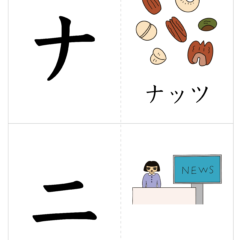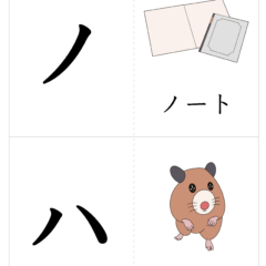 - A4サイズに2文字ずつ、左側が文字、右側が絵(イラスト)を入れたひらがなカード