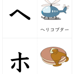 - A4サイズに2文字ずつ、左側が文字、右側が絵(イラスト)を入れたひらがなカード