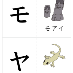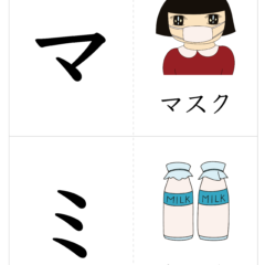 - A4サイズに2文字ずつ、左側が文字、右側が絵(イラスト)を入れたひらがなカード