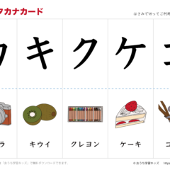 「幼児教材・知育プリント」>「カタカナ練習プリント」「カタカナカード(アイウエオカード)」>「カタカナカード(アイウエオカード)表側「文字」・裏側「絵」」