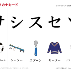 「幼児教材・知育プリント」>「カタカナ練習プリント」「カタカナカード(アイウエオカード)」>「カタカナカード(アイウエオカード)表側「文字」・裏側「絵」」