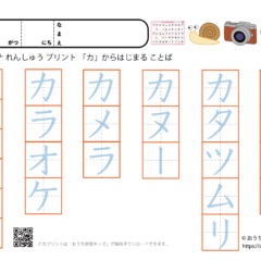 キから始まる言葉|カタカナ練習プリント スポンサーリンク カタカナ練習プリント X Facebook はてブ LINE Pinterest 2022.01.23 「幼児教材・知育プリント」>「カタカナ練習プリント」>「カタカナ練習プリント(○から始まる言葉)」 カタカナ(片仮名)「キ」から始まる言葉の練習ができます。 プリントで使われている「キ」から始まる言葉:キウイ、キッズ、キャベツ、キャンプ、キャンディ、キリン 下の「プリントページ」から無料でダウンロードして、印刷しプリントにできます(PDFファイル)。 プリントページ