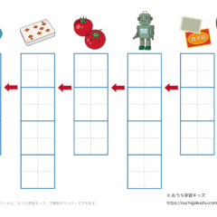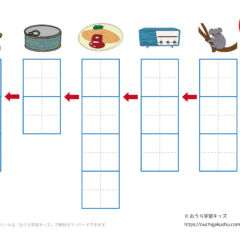 カタカナ練習プリント「しりとり2」(なぞり書き) スポンサーリンク カタカナ練習プリント X Facebook はてブ LINE Pinterest 2022.01.12 「幼児教材・知育プリント」>「カタカナ練習プリント」>「カタカナ練習プリント(しりとり)」 カタカナ(片仮名)練習「しりとり2」の書き取りができます。 文字をそのまま書く「なぞり書き」 「しりとり2」内容:コアラ→ラジオ→オムレツ→ツナ→ナッツ 下の「プリントページ」から無料でダウンロードして、印刷しプリントにできます(PDFファイル)。 プリントページ