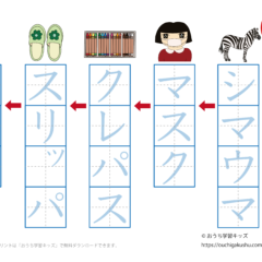 カタカナ練習プリント「しりとり4」(空欄) スポンサーリンク カタカナ練習プリント X Facebook はてブ LINE Pinterest 2022.01.12 「幼児教材・知育プリント」>「カタカナ練習プリント」>「カタカナ練習プリント(しりとり)」 カタカナ(片仮名)練習「しりとり4」の書き取りができます。 文字をそのまま書く「なぞり書き」 「しりとり4」内容:シマウマ→マスク→クレパス→スリッパ→パンダ 下の「プリントページ」から無料でダウンロードして、印刷しプリントにできます(PDFファイル)。 プリントページ