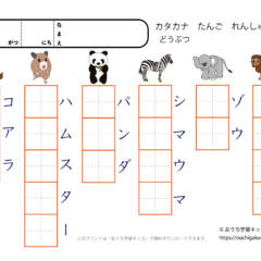 カタカナ単語練習プリント「動物」(簡単なぞり書き) スポンサーリンク カタカナ単語練習プリント X Facebook はてブ LINE Pinterest 2021.09.242025.02.05 「幼児教材・知育プリント」>「カタカナ練習プリント」>「カタカナ単語練習プリント」 カタカナ(片仮名)単語「動物」の練習ができます。 簡単なぞり書き練習用プリント 動物の種類:ライオン、ゾウ、シマウマ、パンダ、ハムスター、コアラ 下の「プリントページ」から無料でダウンロードして、印刷しプリントにできます(PDFファイル)。 プリントページ