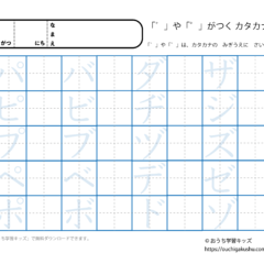 カタカナ練習プリント 拗音1(なぞり書き・濃い文字) スポンサーリンク カタカナ練習プリント X Facebook はてブ LINE Pinterest 2021.07.01 カタカナ(片仮名) 拗音(ャ・ュ・ョ)の練習ができます。 なぞり書き(濃い文字) 下の「プリントページ」から無料でダウンロードして、印刷しプリントにできます(PDFファイル)。 プリントページ