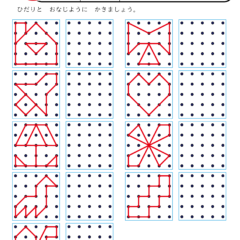 点つなぎ(点描写・点結び:5✕5)2 スポンサーリンク 幼児教材 X Facebook はてブ LINE Pinterest 2023.12.05 「幼児教材・知育プリント」>「点つなぎ」>「点つなぎ(点描写・点結び)」 点つなぎの「点描写・点結び」 グリッド線を結ぶ練習、運筆などの練習 左と同じ点図形を書く(描く) 点の数:縦5✕横5の2枚目 下の「プリントページ」から無料でダウンロード&印刷できます(PDFファイル)。 プリントページ